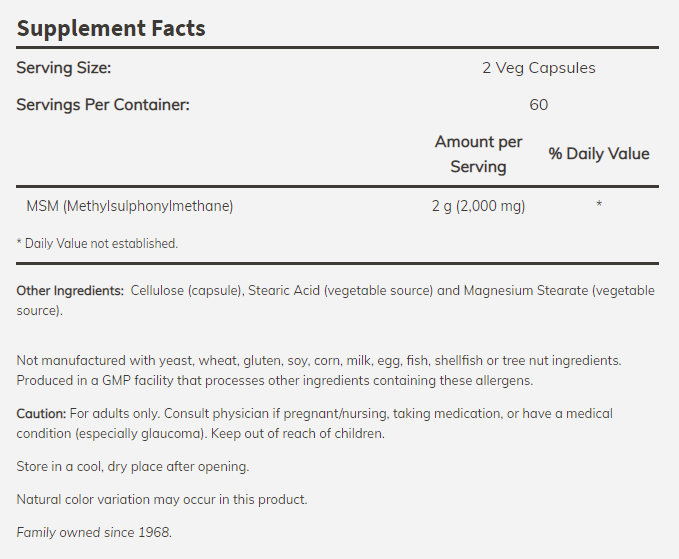 MSM - Метилсулфонилметан е естествена форма на органична сяра, която се съдържа в тъканите на всички живи организми. Той не се съдържа в храни, които са съхранявани период от време или обработвани по различен начин. MSM се свързва с влагата и при дехидратация изчезва с нея.