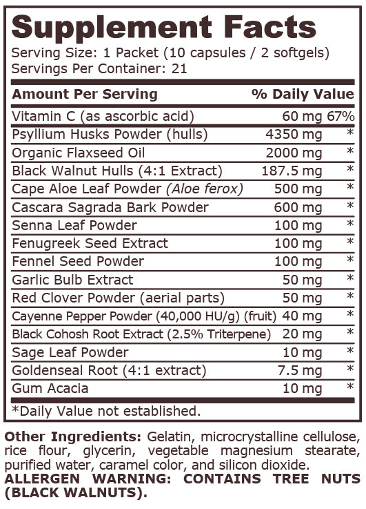 За разлика от тях, CLEANSE PACK е проектиран да бъде цялостна програма за прочистване на дебелото черво. Първо, естествените лаксативи (Cascara Sagrada, Cape Aloe и Senna) и маслото от ленено семе действат, за да разрушат излишните натрупвания по стените на дебелото черво.