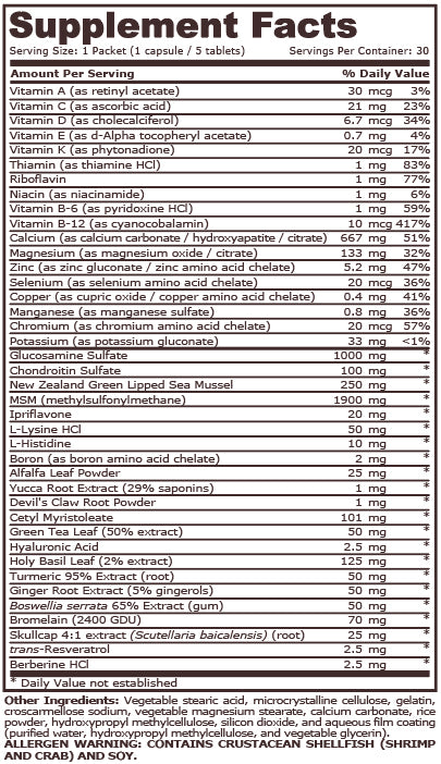 Това е цялостна комбинация от съставки, включително глюкозамин сулфат, хондроитин сулфат, калций, магнезий, МСМ, цетил миристолеат, билкови екстракти и много допълнителни ключови съставки, внимателно формулирани и специално предназначени да поддържат структурата и функцията на вашите стави.